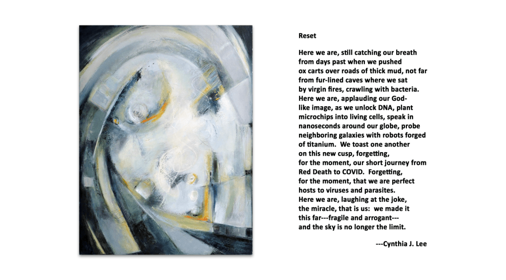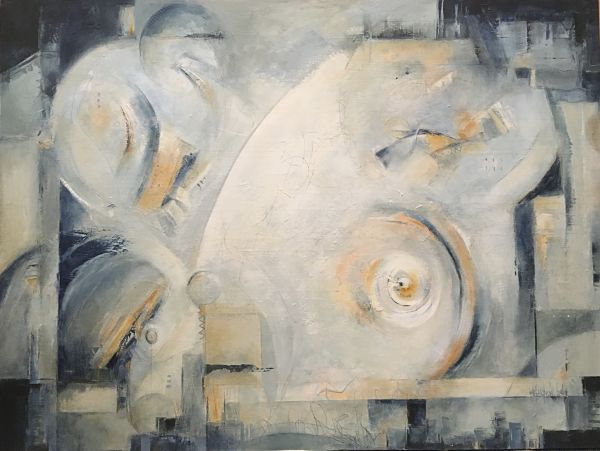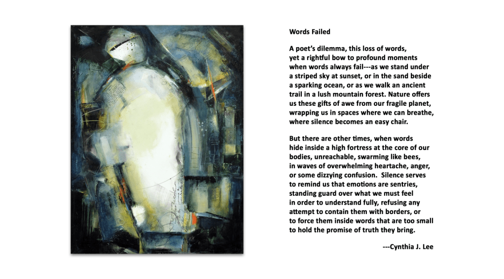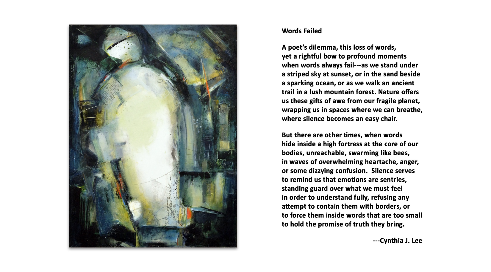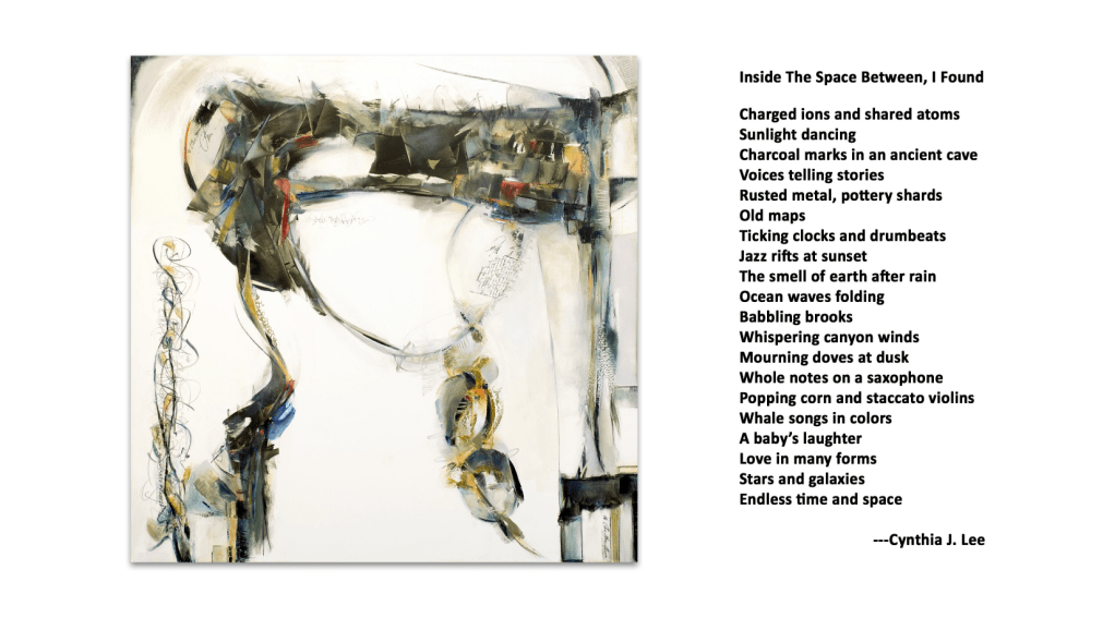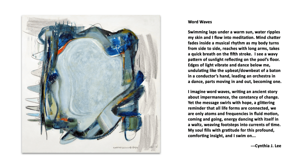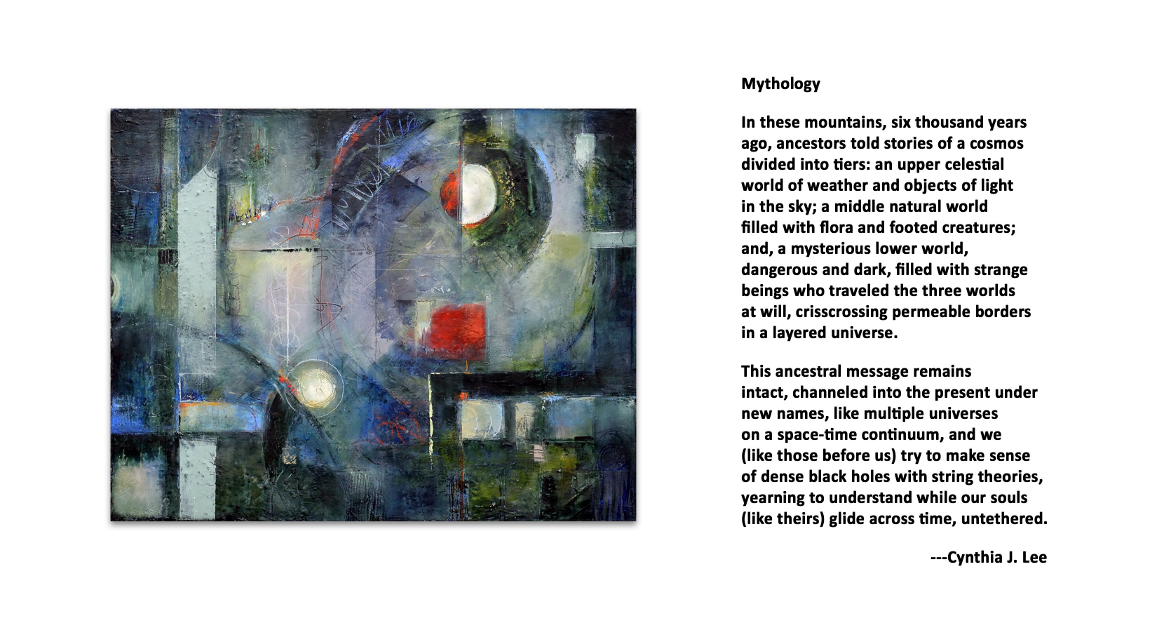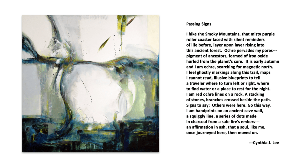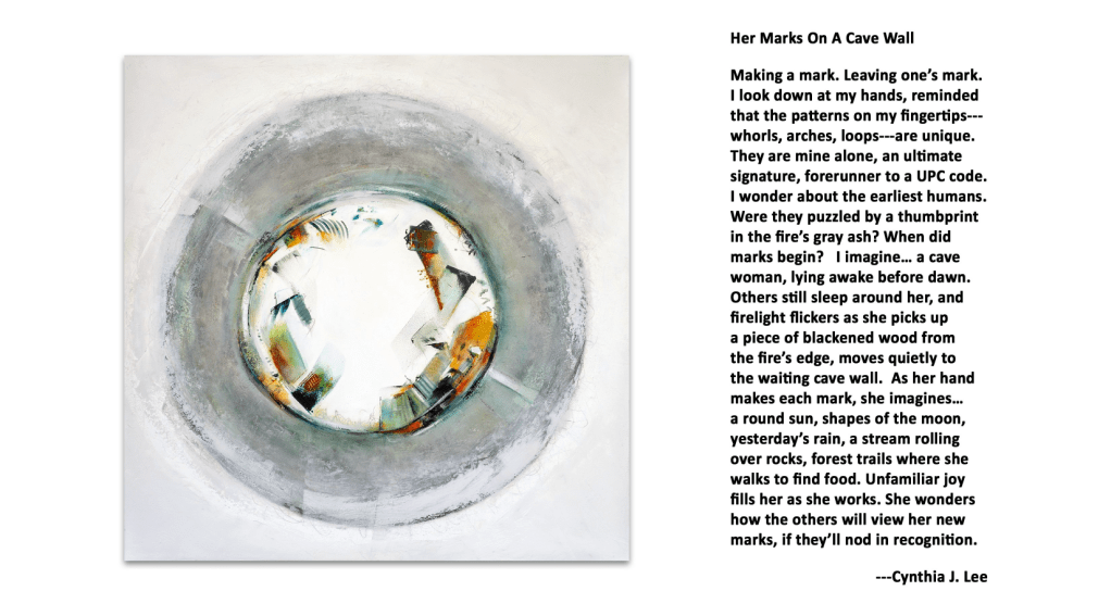 I stand back from the painting on my easel to regard the ancient signs I’ve placed alongside my own marks. There are primordial messages from ancestors whispered here—and I am listening.