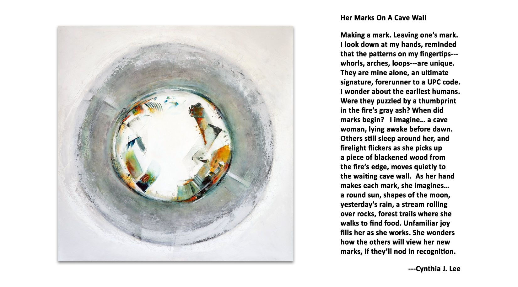 These days I am fascinated by geometric marks made by early humans during the Ice Age. I think of our common ancestors as I place the circles, spirals, triangles, dots and wavy lines they made into my new paintings. They were the original artists. From our tribal beginnings, we humans felt a deep need to share what we saw or experienced with others.